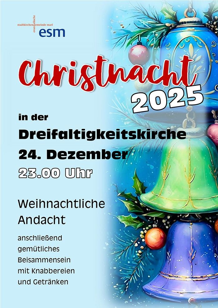 Herzliche Einladung zur Christnacht in die Dreifaltigkeitskirche. Am 24. Dezember feiern wir um 23.00 Uhr eine weihnachtliche Andacht. Wir freuen uns auf Sie.