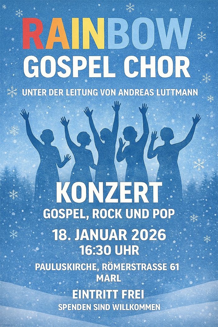 Den Rainbow Gospelchor gibt es seit über 20 Jahren. Vor 3 Jahren ging unsere geschätzte Chorleiterin, Charlotte Charlier, in den Ruhestand. Durch puren Zufall lernten wir Andreas Luttmann aus Gelsenkirchen kennen. Er leitet vier Chöre, z.B. auch den Polizeichor Gelsenkirchen. Einige Damen aus dem Marler Chor, haben sich inzwischen auch dem Polizeichor angeschlossen. Durch den neuen Chorleiter hat sich nicht nur der Gesang verändert, auch das Repertoire wurde komplett erneuert. Wir freuen uns auf viele mutige Zuschauer. Einlass ist ab 16 Uhr. Kommt und genießt 90 Minuten Überraschungen.