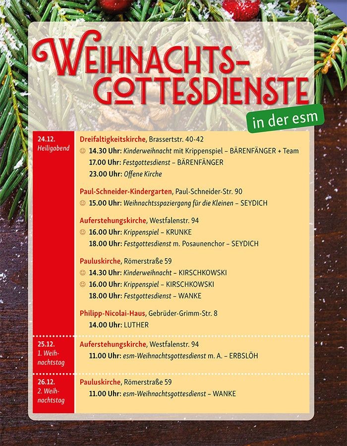 Alle Weihnachtsgottesdienste auf einen Blick. Zum Nachlesen gibt es alle Termine auch unter www.esm.de/gottesdienste.